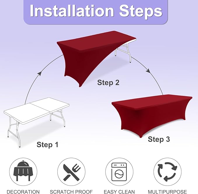 - 3.Which One Should You Choose?: Whether you're using for everyday use in your home or in commercial establishments such as restaurants, hotels and cafes. Our inexpensive rectangle spandex table covers which have the size of 4FT, 5FT, 6FT, 8FT and multicolor will match your table and decor perfectly. Table covers in multipacks are even more cost effective because after taking into account the cost of packaging and transportation.