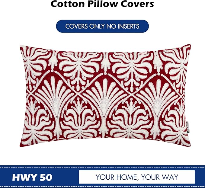 HWY 50 Burgundy Red Decorative Lumbar Pillow Cover Rectangle 12x20 Inch (1 Piece), Embroidered Cotton Farmhouse Cushion Cover Pillow Case for Sofa Couch Living Room Bed, Minimalist Floral