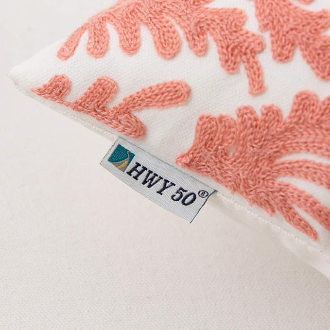 HWY 50 Coral Pink Decorative Throw Pillow Covers 18x18 Inch (1 Piece), Embroidered Cotton Farmhouse Cushion Cover Pillow Case for Sofa Couch Living Room Bed Bedroon, Floral Branches