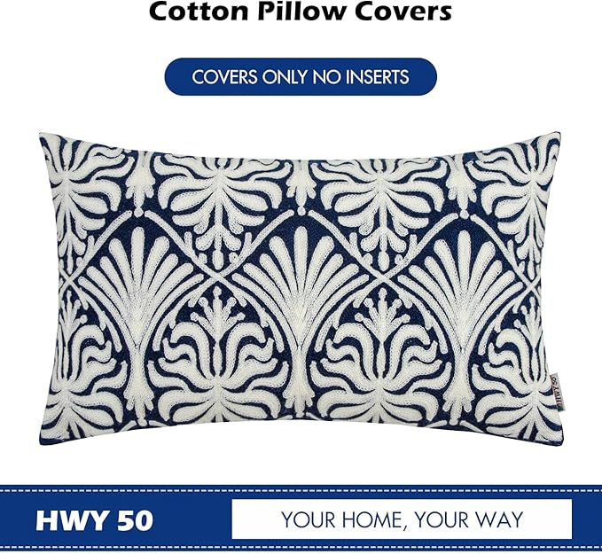 HWY 50 Navy Blue Decorative Lumbar Pillow Cover Rectangle 12x20 Inch (1 Piece), Embroidered Cotton Farmhouse Cushion Cover Pillow Case for Sofa Couch Living Room Bed, Minimalist Floral