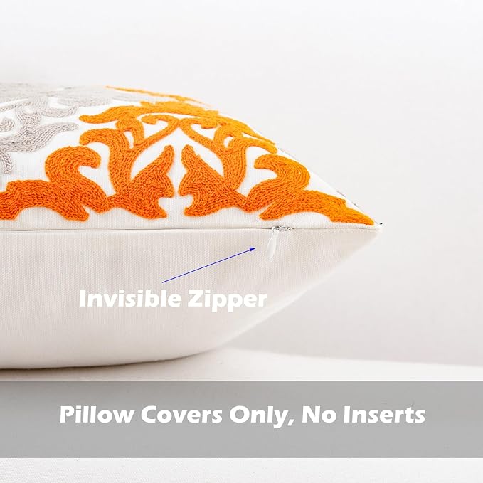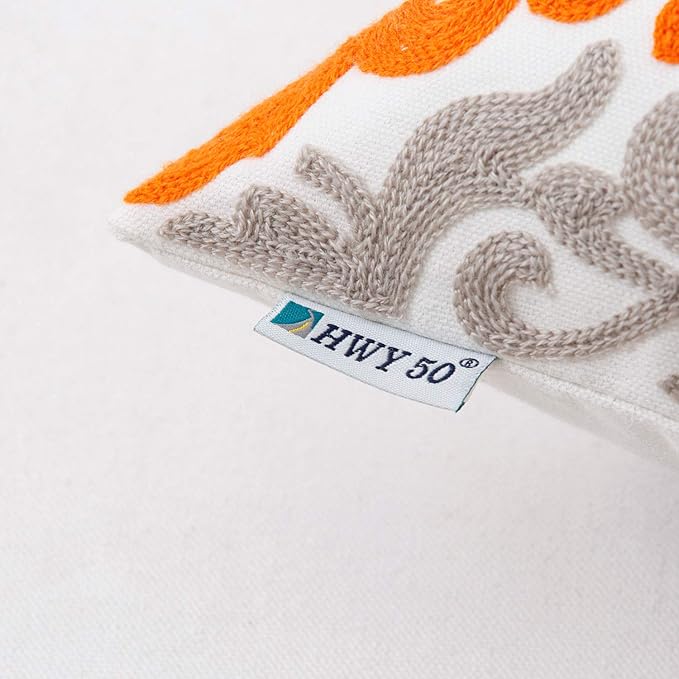 HWY 50 Orange Fall Decorative Throw Pillow Covers 18x18 Inch (1 Piece), Embroidered Cotton Farmhouse Cushion Cover Pillow Case for Sofa Couch Living Room Bed Bedroon, Floral Geometric