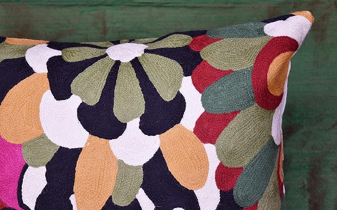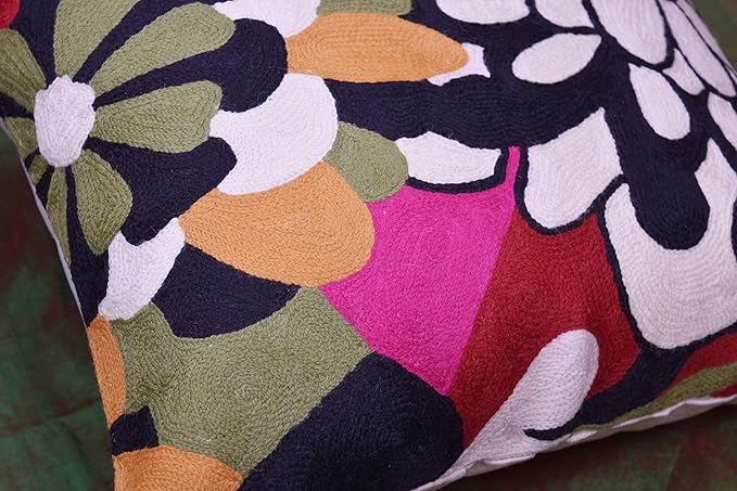 - π FLORAL THROW PILLOW COVER - HAND EMBROIDERED: These colorful flower pillows are inspired from contemporary modern floral art designs and are hand embroidered in soft wool to perfection, stitch by stitch, by the finest artisans, creating an extraordinary all modern floral design pillow for your home decor. A close-up view of this all modern flower cushions allows you to see the amazing fine chain-stitch hand embroidery that covers the whole front side of this floral pillowcase.