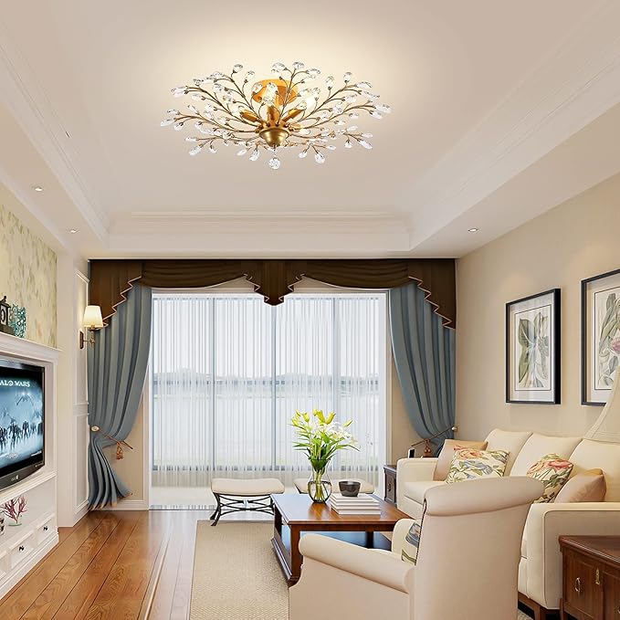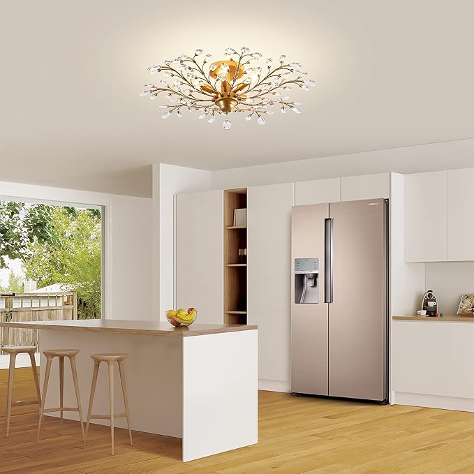 - CLASSIC DESIGN: This gold ceiling light is beautifully decorated.Use transparent glass crystals to capture and reflect the light of the bulb,sparkling and shiny light effect to created a warm and soft atmosphere.
