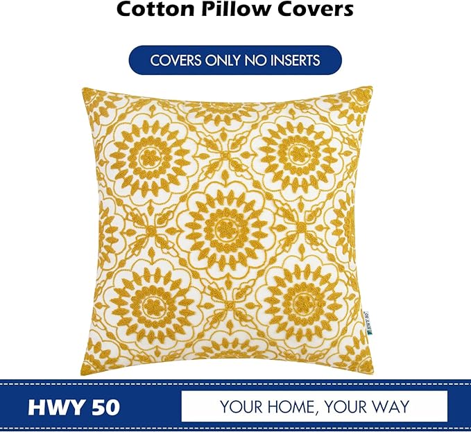 HWY 50 Yellow Decorative Throw Pillow Covers 18x18 Inch (1 Piece), Embroidered Cotton Farmhouse Cushion Cover Pillow Case for Sofa Couch Living Room Bed, Little Sunflower