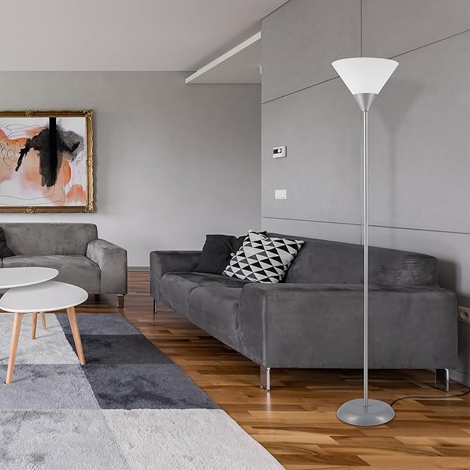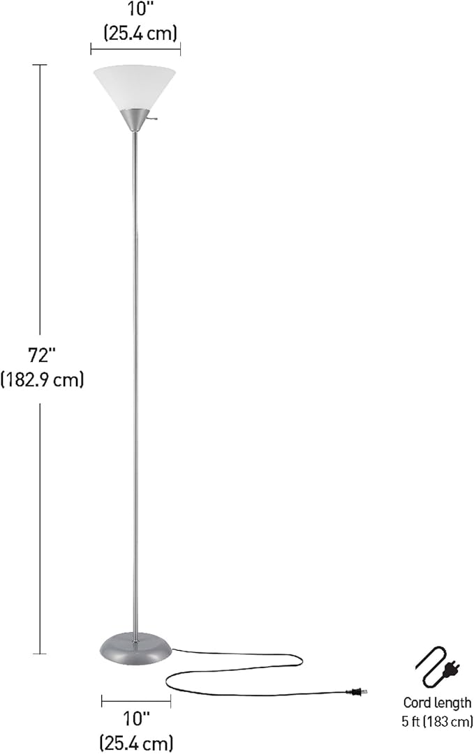 - FROSTED SHADE: the white frosted plastic shade blends perfectly with the torchiere style lamp to create a warm light spread
