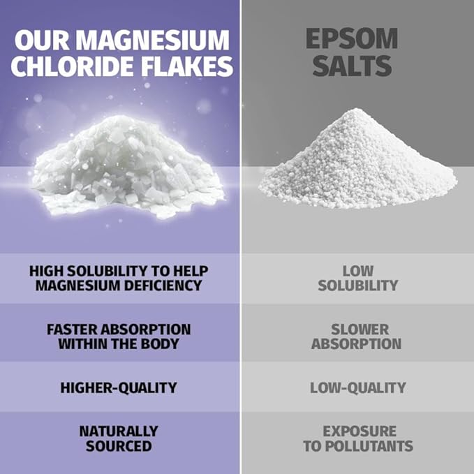- Elevate your bath routine with Transdermal Magnesium Chloride flakes, surpassing Epsom salts in absorption. Tailored for feet or muscles, our pure bath salt blend aims to promote relaxation after a long day.