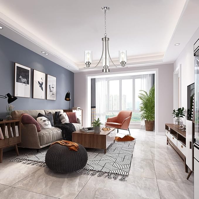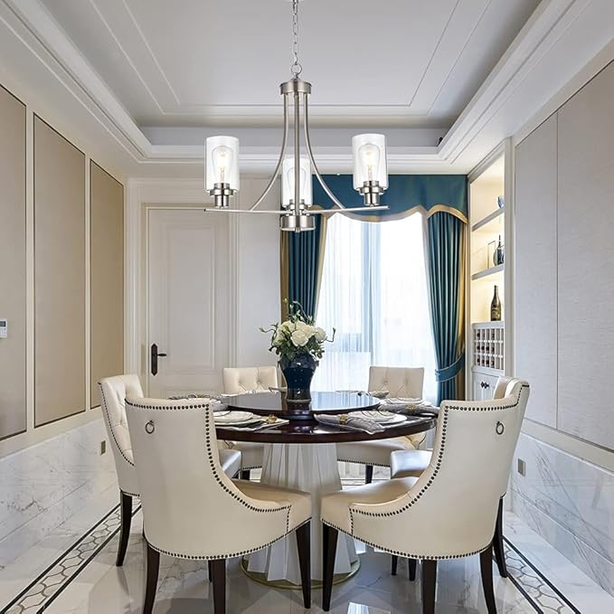 - π 3 Light Modern Glass Chandelier: This rustic kitchen dining room chandelier with high clear glass shadesοΌit is an elegant update for traditional and modern homes alike.It's the perfect light fixture to install in kitchen, island, dining room,living room,foyers ,hallway,bedroom,coffee bar, lobby, restaurant and any space you like.