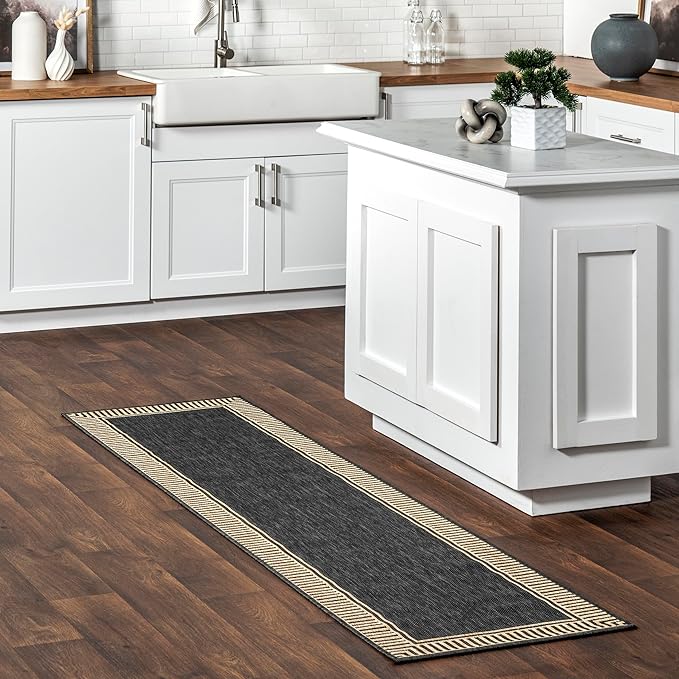 nuLOOM 2' x 8' Outdoor Area Rug, Casual Design With Striped Border, Stain Resistant, Highly Durable, For Patio, Balcony, Bedroom, Living Room, Dining Room, Bathroom, Dark Grey