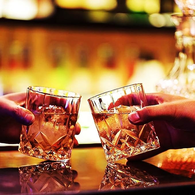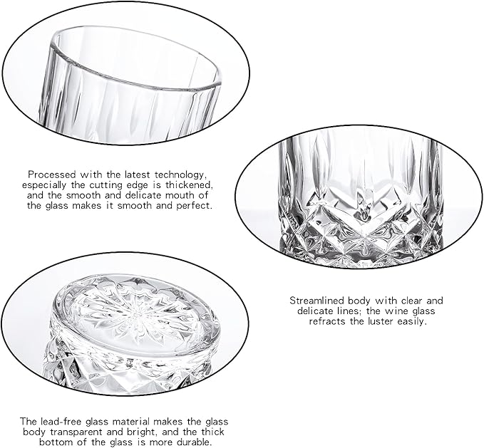 - 【Classic Whiskey Glass】All our crystal whiskey glasses feature uneven surfaces and high-quality craftsmanship, inspired by chrysanthemums, butterflies and sunlight. Transparent, shiny and elegant appearance gives it maximum clarity and brightness. The classic whiskey glass has an antique appearance and is of medium size. Whether it is a formal or informal occasion, it will look elegant, chic and cool.