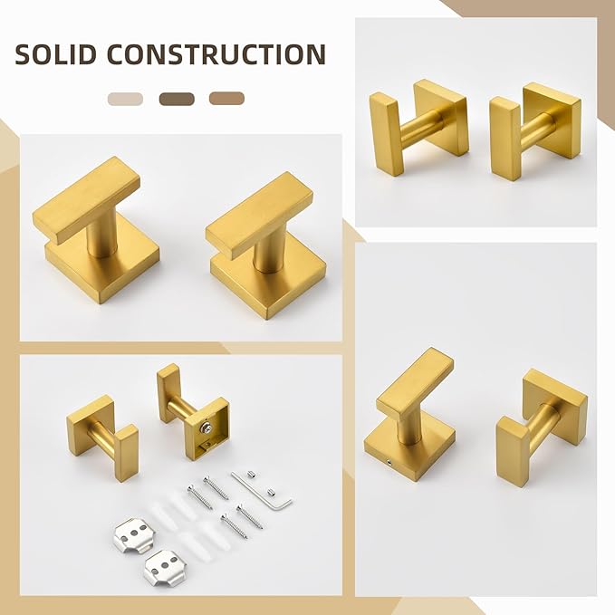 Angle Simple Towel Hooks for Bathroom, SUS 304 Stainless Steel Square Robe Coat Wall Hooks, Hand Towel Holder, Brushed Gold, 2 Pack