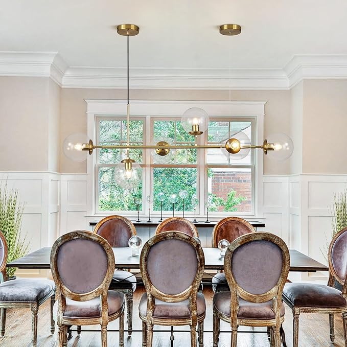 - 【Clear Glass Linear Chandelier】The modern gold chandelier adopts simple iron style and modern linear shape design, inspired by modern elements, each clear bubble globe is arranged around the rectangle lamp body, it's very artistically decorated. Long linear chandelier for kitchen island update your home with its mid century modern style and eye-catching design and complement your space with timeless contemporary aesthetics.