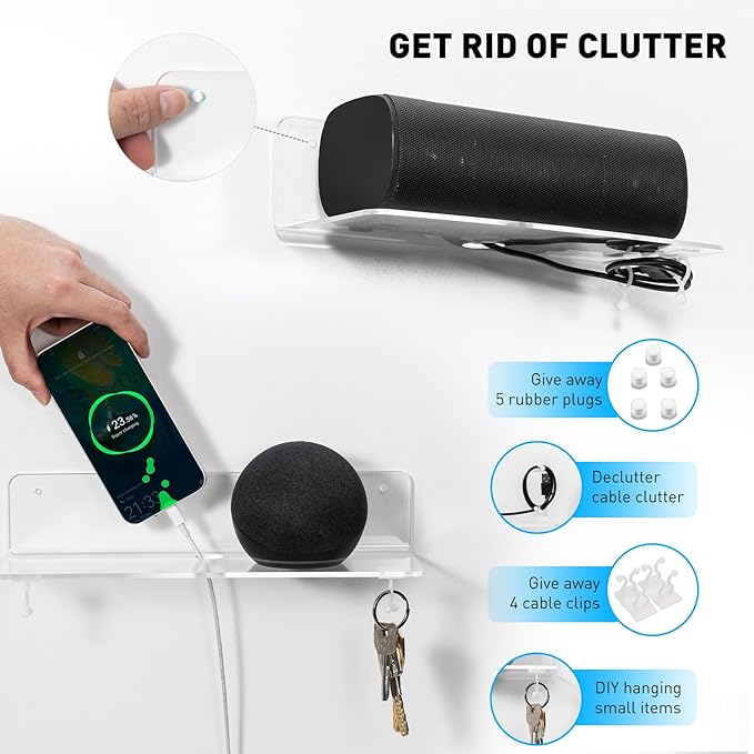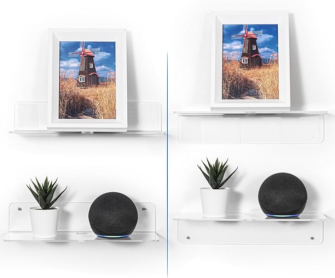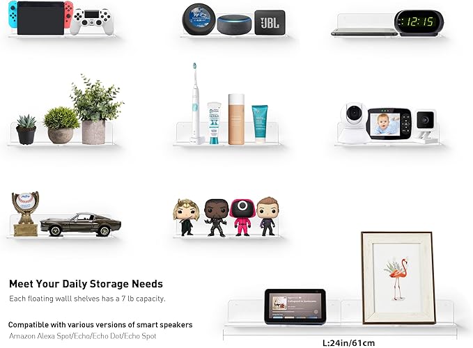- DURABLE & STRONG: The clear acrylic shelves are made of high-quality acrylic, exquisite workmanship, durable and strong enough to hold up to 7 pounds. Convenient and non-damaging storage for items such as cosmetics, smart speakers, baby monitors, action figures, and more.