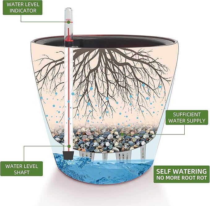 - SELF WATERING & NO MORE ROOT ROT - The smart unique sub-irrigation system is one of the most appealing aspects among all Dexceder planters. The easy-to-use separated integrated water reservoir or catcher- keeps your soil well aerated and automatic supplies plants with the right amount of ongoing moist air & nutrition for optimal growth. The insert indicator shows you the exact time to water again. The full water supply period can single-handedly last over 3 weeks based on different live plants