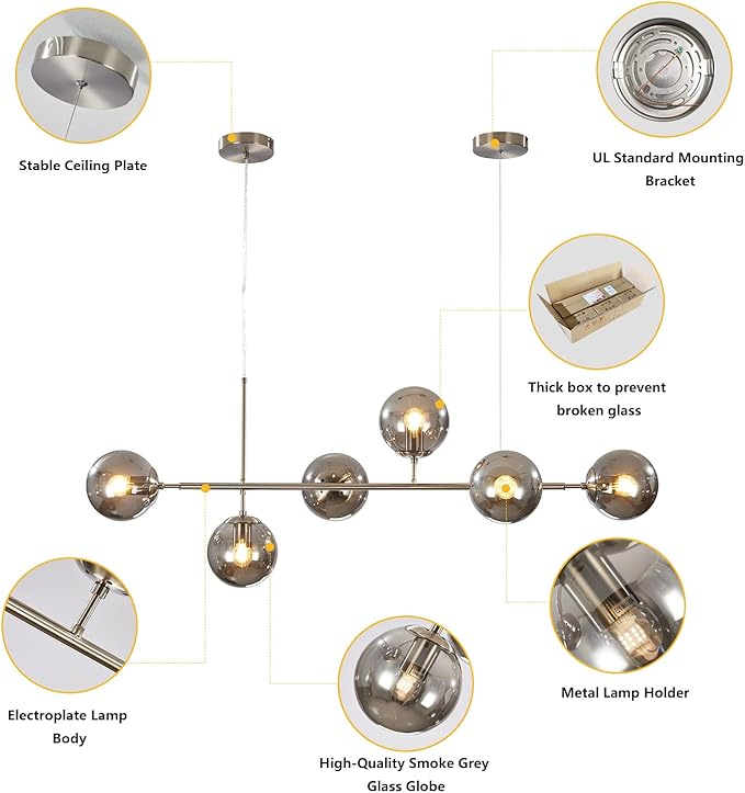 - Smoky Sputnik Chandelier Size: The glass globes linear chandelier length: 47.2" (120cm), height: 17.7"(45cm), glass shade: 5.9"(15cm)(Shade replacement ASIN: B083H6XP8H), canopy: 4.7"(12cm). Light source: E26 (bulb not included)(Bulb replacement ASIN: B081WVNCVM), voltage: 110-220V for worldwide