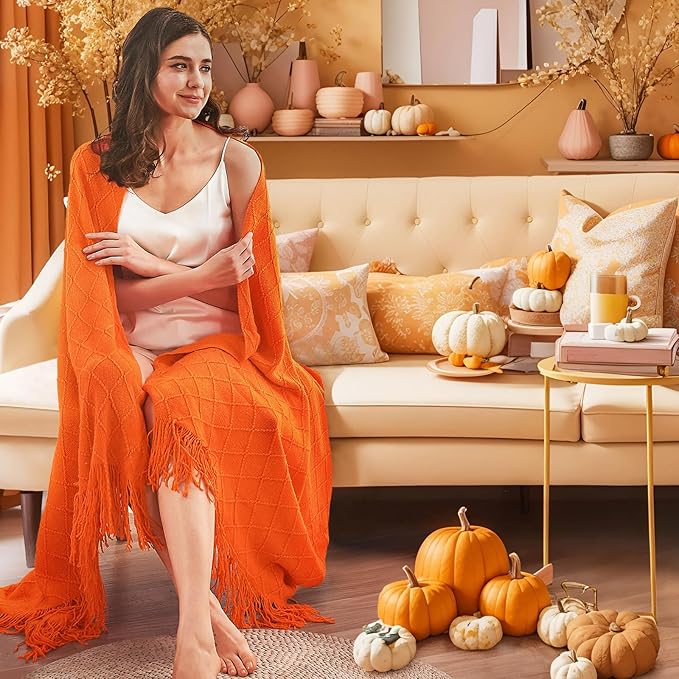 inhand Fall Throw Blanket Burnt Orange for Couch, Soft Living Room Home Decor Knitted Twin Size Blanket, Outdoor Lightweight Breathable Summer Blanket, Farmhouse Warm Woven Decorative, 60"x80"