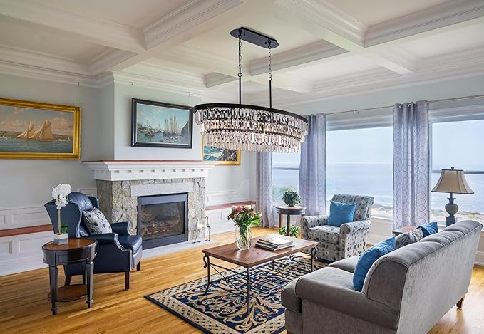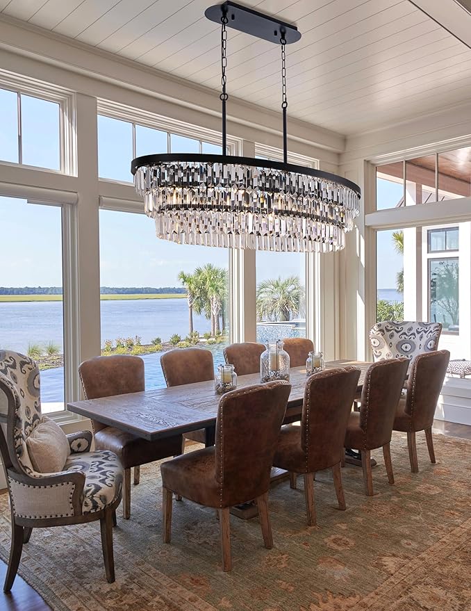 TOCHIC Chandelier 40 inch, Farmhouse Black Crystal Chandelier, Kitchen Island Lighting, Dining Room Light Fixture for High Ceiling, Modern Linear Oval Chandeliers for Living Room, Office Area, Bar