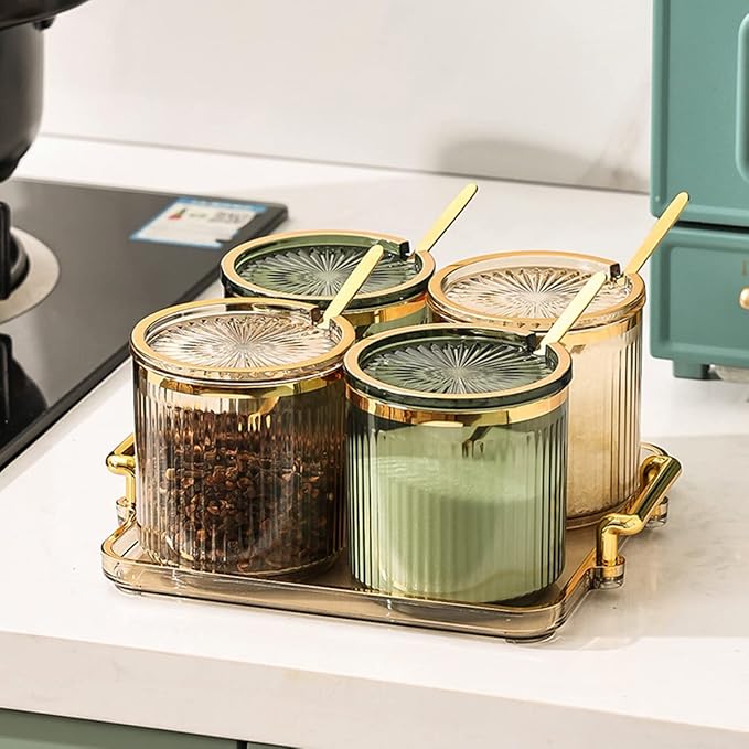 Acrylic Condiment Spice Jars,Condiment Spice Box With Lids and Spoons and Tray,Clear Plastic Condiment Canisters,Seasoning Box 4 Pack,Seasoning Box Set for Kitchen to Storage Salt,Paprika,Sugar