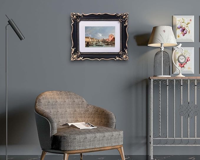 - Easy to Display: This 8x10 black ornate frame comes with a removable white mat and a decor picture. The white mat can be entirely removed for 8x10 paintings or keep it for 5x7 paintings, perfect to display any photos or paintings. The back of frame is a soft velvet back plate equipped with a easel and two-way serrated hook, which can be displayed on tabletop or hang on the wall in vertically or horizontally.