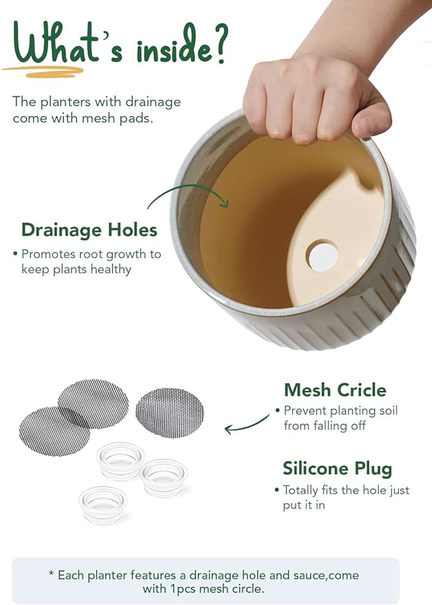 - Custom Drainage Planter System: Each ceramic plant pot includes a drainage hole, silicone plug and mesh pad—leave open for quick runoff or insert the plug to slow moisture, tailoring care to cactus, herbs or tropical foliage