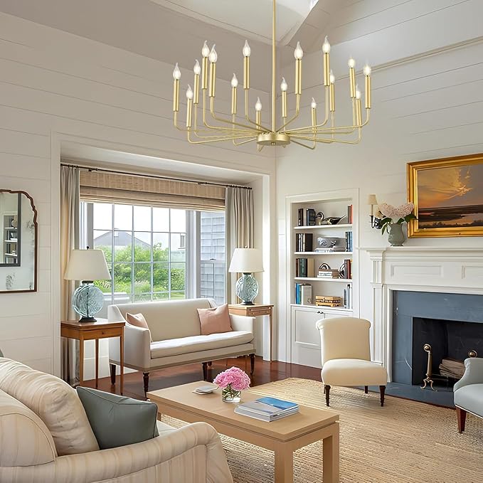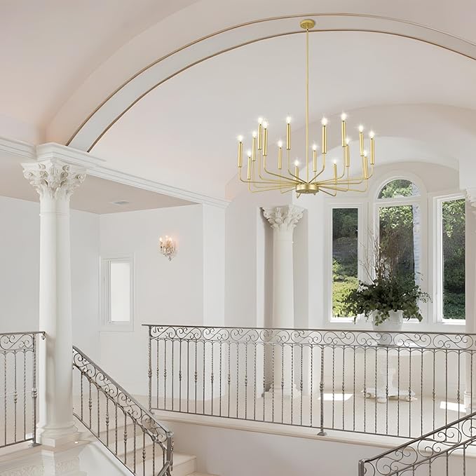 - Modern Fashion Design: A classy candelabra chandelier with different lengths of arms and gold matte finish which allows you to clean easily. The appearance of 16 uneven arms look genuine and novel. The whole minimalist design is classic but not rigid. With this simple and retro look can upgrade your space that is elegant but generous