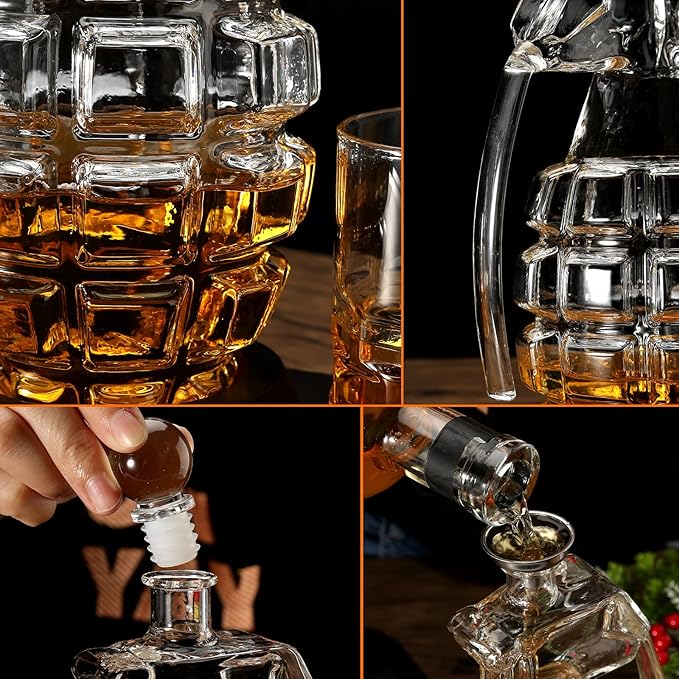 - Unique Decanter Design - exreizst Whiskey decanter features a unique grenade shape, just like a work of art. Ergonomically designed handle makes it more comfortable and convenient to use. Even when not in use, placed in the living room or study can play a decorative role, making the layout look more elegant and advanced