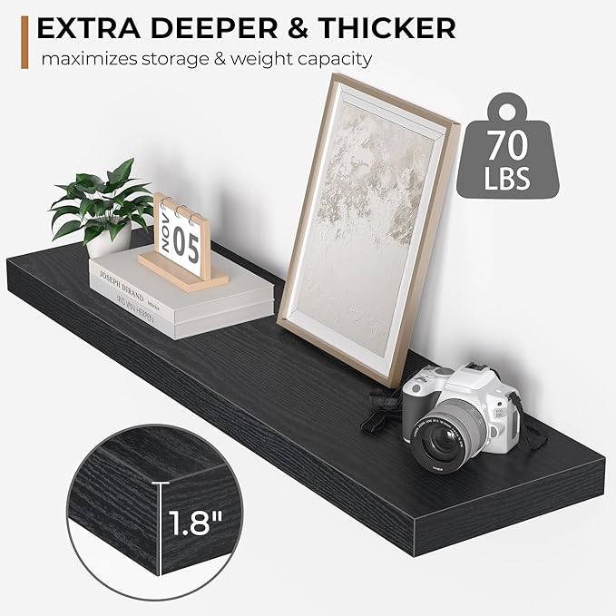 - Extra Deeper & Thicker - This wall shelf measures 36"W x 10.23"D x 1.8"H. Extra deeper and thicker design in order to bring maximizes storage space and weight capacity, even hold up to 70 lb. This floating shelf taking up zero square feet, reduces clutter and highlights dΓ©cor in compact spaces.