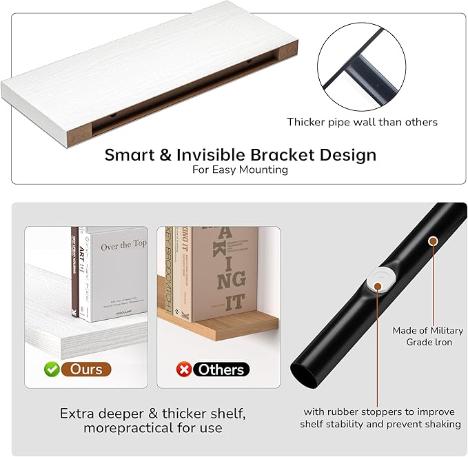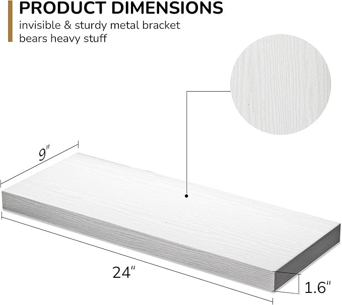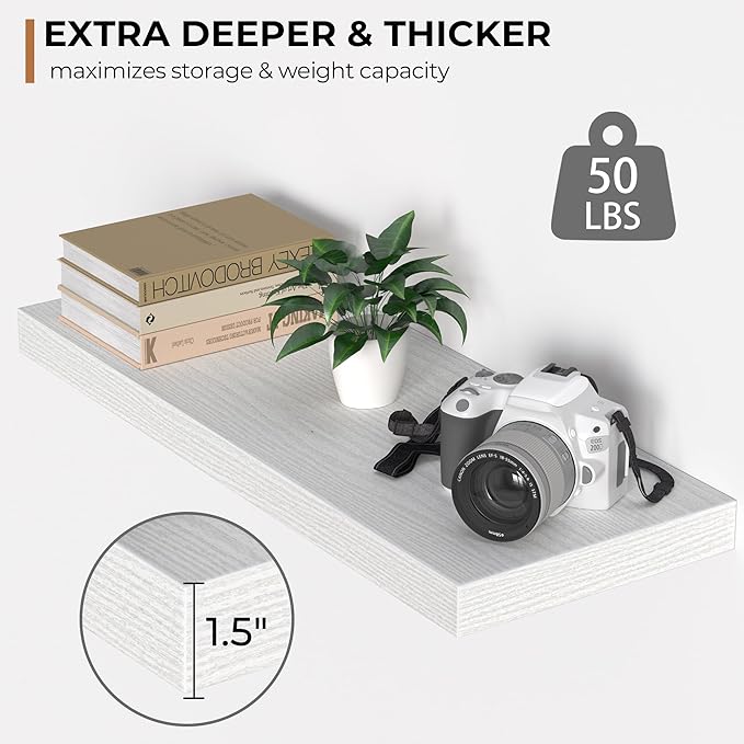 - Extra Deeper & Thicker - Each board measures 24"W x 9"D x 1.6"H. Extra deeper and thicker design in order to bring maximizes storage space and weight capacity, even hold up to 50 lb each. This floating shelf taking up zero square feet, reduces clutter and highlights dΓ©cor in compact spaces.