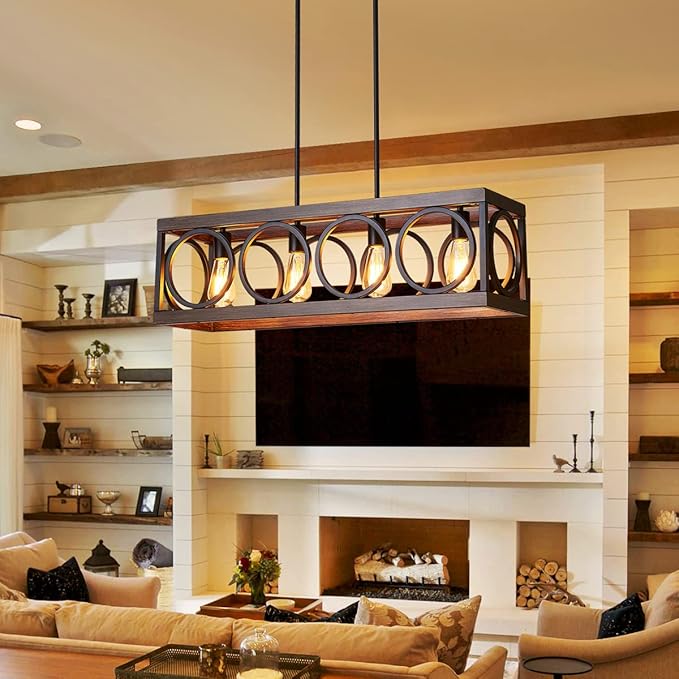 - [Distressed Wood Grain Finish Chandelier]: Add a touch of vintage farmhouse style to your dining room or kitchen island with this open-cage chandelier, featuring a rectangle frame in distressed wood grain finish metal and a barn-inspired circular design. Each chandelier is uniquely hand-painted, making it one-of-a-kind.