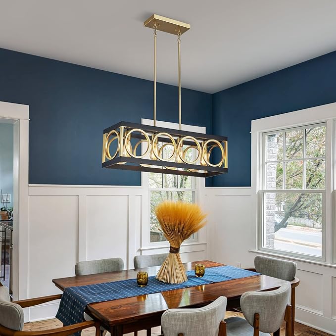 - [UNIQUE PENDANT LAMP]The open-cage farmhouse dining room light fixture features a rectangle frame in black and gold finish metal with a barn-inspired circular design stretching across each side, recalling reminiscent of classic, coastal and vintage aesthetics.