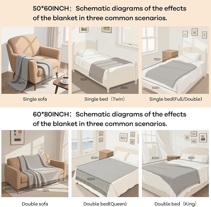 - 【HOW TO CHOOSE THE RIGHT COLOR AND SIZE】: The color visual effect of the product may vary slightly under different displays and light conditions. The blanket is tightly rolled up for packaging. After receiving it, it is recommended to let it stand for a few days or wash it, which can help it quickly return to its normal size. Meanwhile, the product is made by knitting, so the blanket will have a certain degree of elasticity. A measurement error of 1-2 inches is a normal phenomenon.