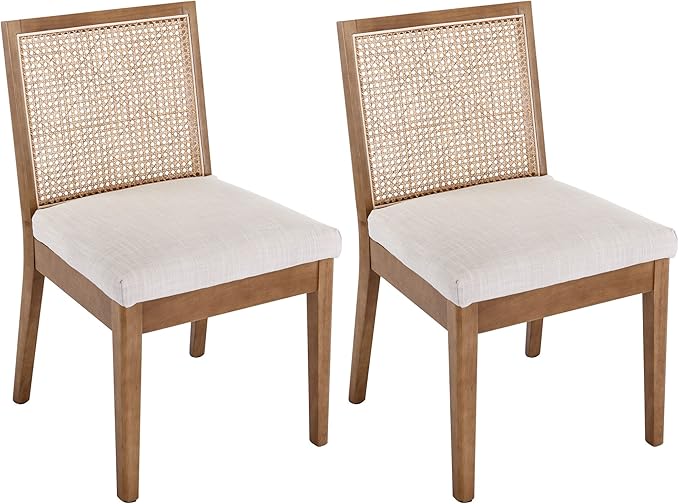 VESCASA Upholstered Dining Chairs with Square Rattan Back, Armless Padded Linen Cushion Dining Chairs with Wood Legs for Dining Room, Kitchen, Set of 2, Natural Frame