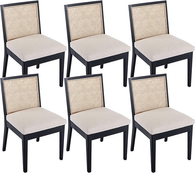 VESCASA Upholstered Dining Chairs with Square Rattan Back, Armless Padded Linen Cushion Dining Chairs with Wood Legs for Dining Room, Kitchen, Set of 6, Black Frame