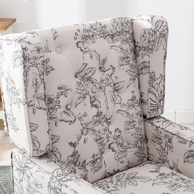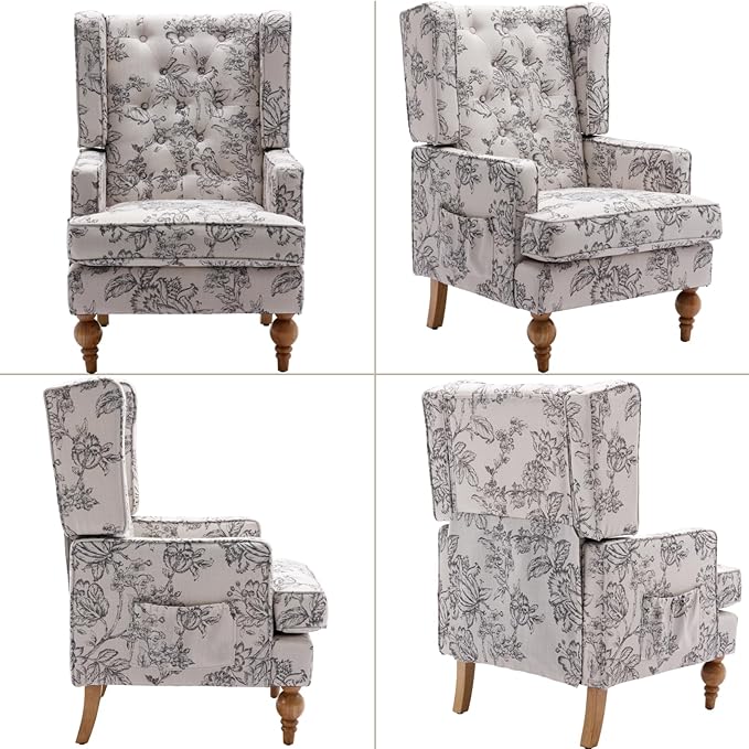 Mid-Century Accent Chair, Upholstered Arm Chair Linen Fabric Side Chair with High Back Solid Wooden Legs, Comfy Reading Chair for Living Room Bedroom, Floral Pattern