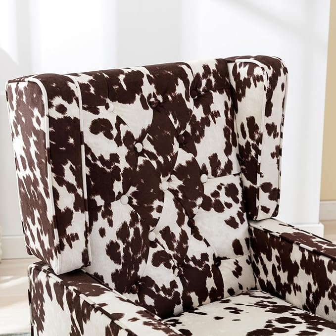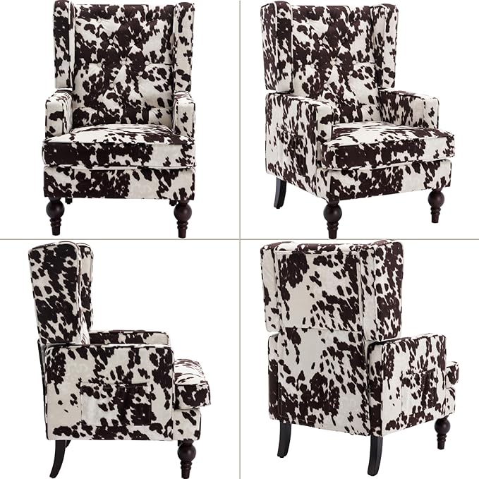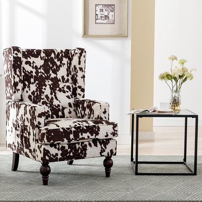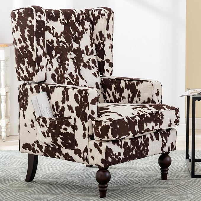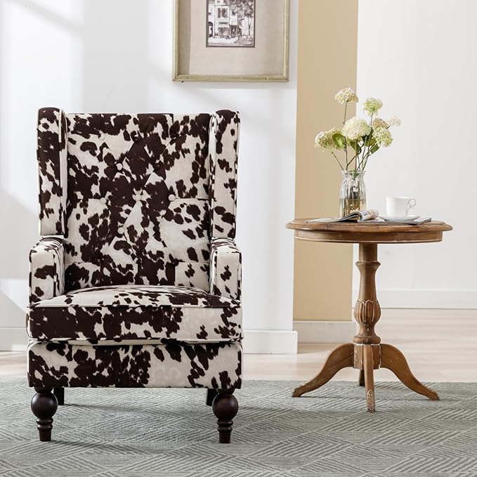 Mid-Century Accent Chair, Upholstered Arm Chair Linen Fabric Side Chair with High Back Solid Wooden Legs, Comfy Reading Chair for Living Room Bedroom, Milk Cow