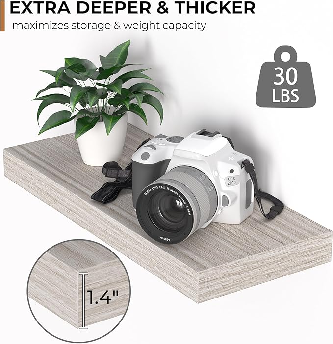 - Extra Deeper & Thicker - Each board measures 16"W x 6.7"D x 1.4"H. Extra deeper and thicker design in order to bring maximizes storage space and weight capacity, even hold up to 30 lb each. This floating shelf taking up zero square feet, reduces clutter and highlights dΓ©cor in compact spaces.