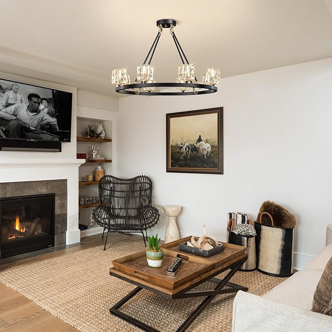 - 【Farmhouse Wagon Wheel Chandelier】This black-and-gold chandelier features a round carriage-style frame and 8-lights K9 crystal shade that refracts light to a stunning brightness, black Gold and square crystal make the chandelier more modern and farmhouse-style, suitable for dining room, living room, foyer, can also be used as ceiling light in the bedroom, study, suitable for any corner of the home