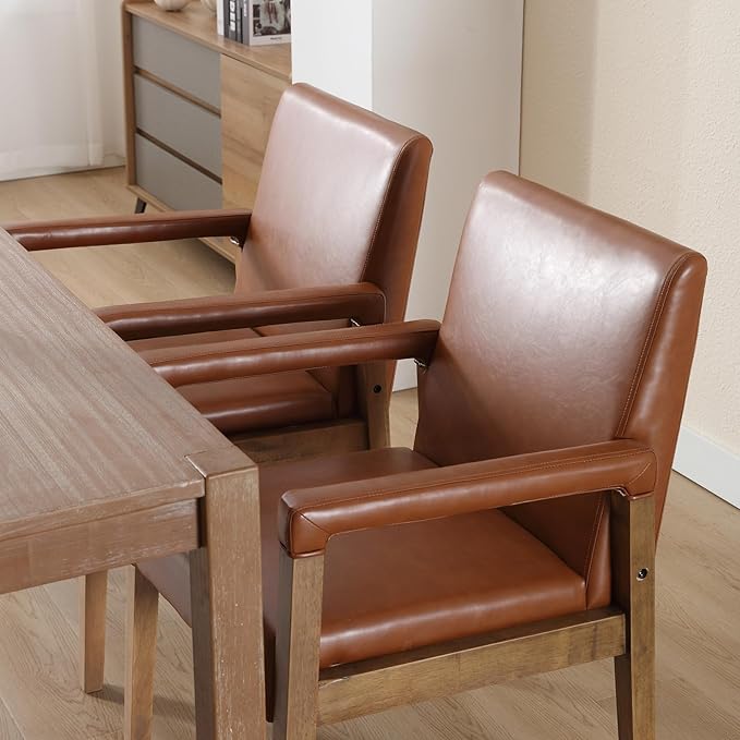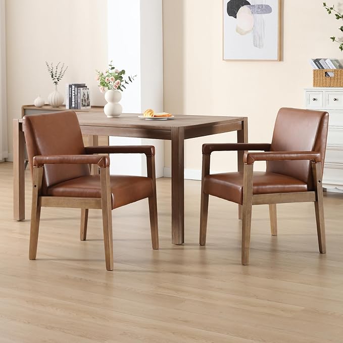 Mid Century Modern Dining Chairs Set of 2 Faux Leather Upholstered Living Room Side Chair, Kitchen Arm Chair with Solid Wood Legs for Home Kitchen & Restaurant, PU Brown