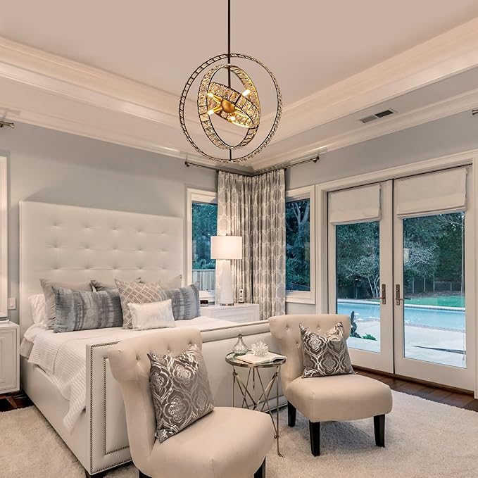 - 【Unique Design】Crystal globe sputnik chandelier with adjustable round shade, by rotating the circle, you will get round chandeliers of different shapes; turn on the lamp, there will be beautiful sparkling light effects; suitable for living room, dining room, hallway, bedroom, kitchen island, etc.