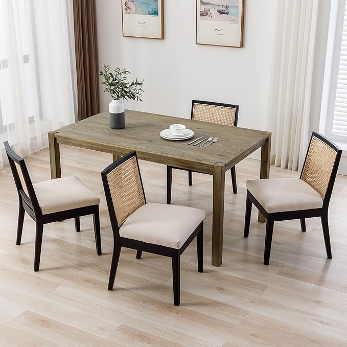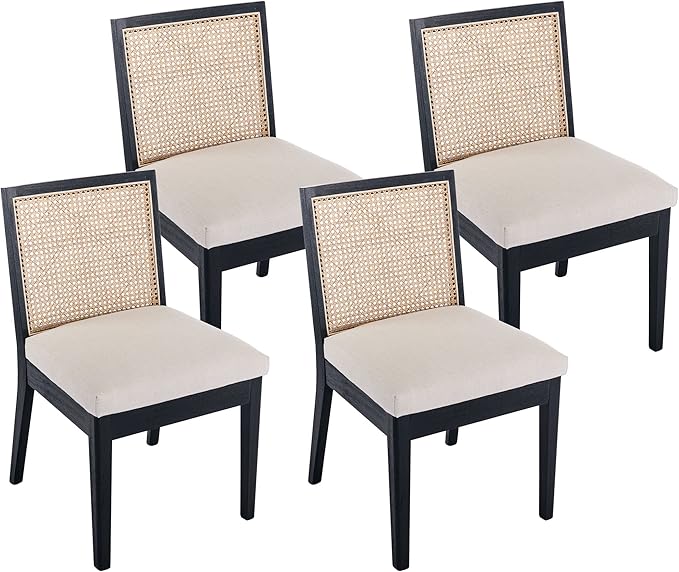VESCASA Upholstered Dining Chairs with Square Wooden Rattan Back, Armless Padded Linen Cushion Dining Chairs with Wood Legs for Dining Room, Kitchen, Set of 4, Black Frame