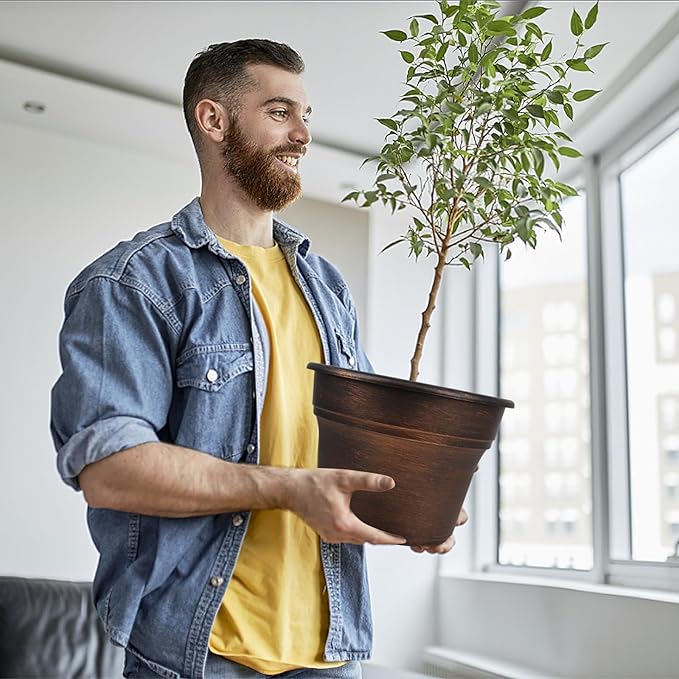 - 【TRADITIONAL DESIGN】Plastic planters for indoor plants with trays are designed in in dark gold colors & a classic look, which allow this pot to fit into any indoor & outdoor setting. With these golded flower pots, it could adds fresh, decorative flair to your home. Decorate your windowsill, desktop, shelf, bedroom, living room, kitchen, garden, office with our 11 inch plastic plant pot.