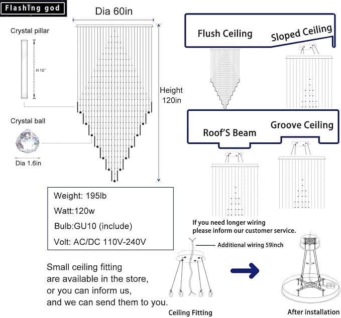 Flashing God D59''X H120'' Extra Large Chandeliers for High Ceilings Crystal Raindrop Chandeliers Large Villa Chandelier Entrance Foyer Ceiling Light LED Dimmable 2700K-6000K