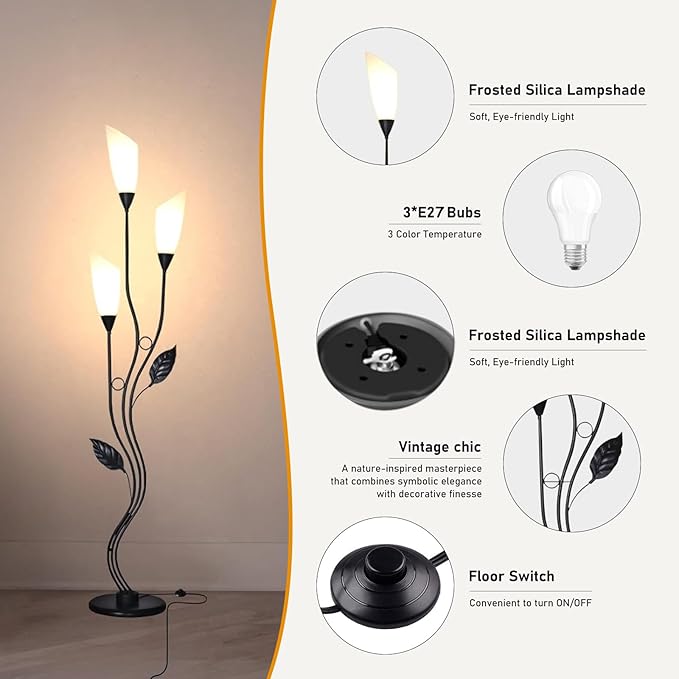 JBZ Flower Floor Lamp for Living Room, 62" Tall Pole Lamp with Foot Switch, with 3 Heads Dimmable LED Lamps for Farmhouse Rustic Bedroom Office, with Plug and 1200LM, 3 Color Temperatures E27