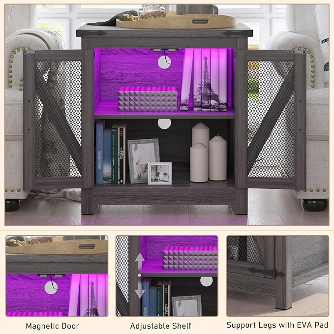 Farmhouse End Table, 24" Large Sofa Side Table with Charging Station, Mesh Barn Door, and Adjustable Storage Shelf, Rustic Wood Square Nightstand for Living Room, Bedroom, Office, Grey