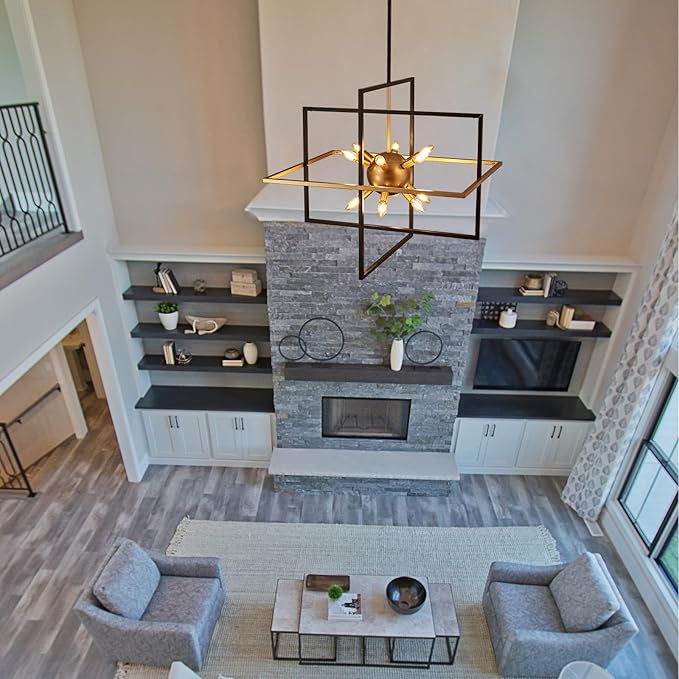 - 【Large-Scale Frame Design】The stunning combination of modern and industrial elements brings an unprecedented sense of style to your space with this awe-inspiring cubic geometric pendant light. The center of the artificial satellite chandelier features 12 golden lights surrounded by two layers of rectangular metal frames. It's perfect for living rooms, kitchen islands, dining rooms, hallways, staircases, entrances, coffee shops, and restaurants.