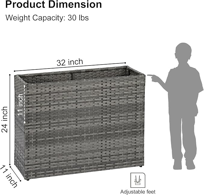 - Product Details - Dimensions (LxWxH) Plant pot: 32 x 11 x 24 inch Material: PE rattan, Powder-coated Steel, Plastic , Adjustable Feet
