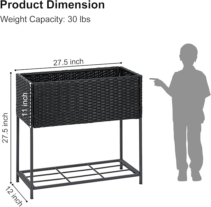 - Dimension: With a 27.5’’ L x 12’’ W x 27.5’’ H elevated planter that holds up to 2 cubic feet of soil, the planter box provides ample breathing and growing space for your vegetables and plants. Available in flat packaging, easy to assemble and with detailed instructions.