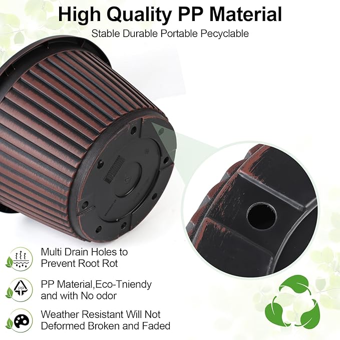 - 【Modern Style Planters】10 inch indoor planters with saucers provide a unique,nice style in ribbed design which gives an understated elegance that will enhance the beauty of your plant. These 10 inch plant pots are available in red-brown &blue-green & gold finished with a black antique stain. Plastic flower pots would be a beautiful addition to anyone’s deck or sunroom or house! for indoor and outdoor . With better breathabiity and water absorption, it’s beneficial to the healthy growth of plants.