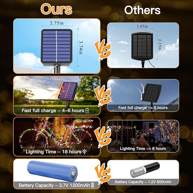 - 【Fast Charging Long Lasting】The outdoor string lights equipped with an1200mAh rechargeable battery that can be quickly fully charged within 6 hours. Once charged, the lights can shine for about 18 hours. The lights are also equipped with a built-in sensor that automatically turns them on at dusk and off at dawn, making them more efficient and convenient to use
