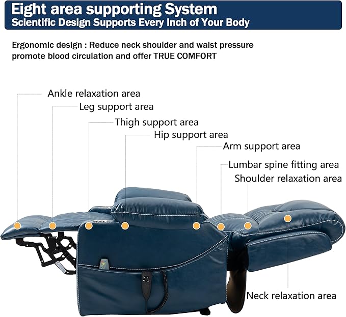 - 【Massage & Lumbar Heating】This electric recliner is specially designed with 8 vibrating points massage (back/lumbar/thighs/legs), lumbar heating function is good for waist pressure relief and blood circulation, taking away the stress and tiredness. The timer function in 15/30/60 minutes which is convenient for you to set massaging time. Own this lay flat recliner chair, you can have a full body massage at home.