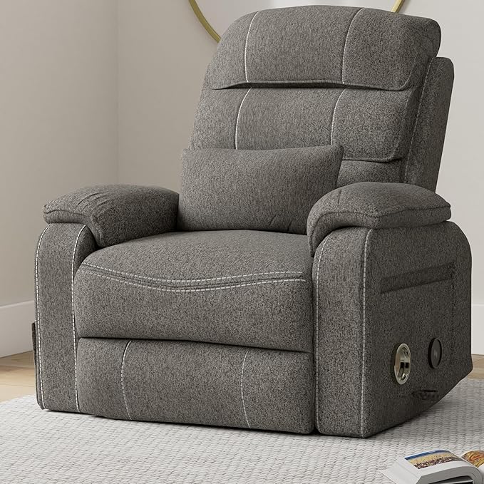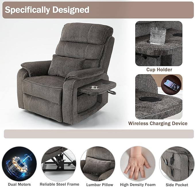 - 【Cup Holder & Wireless Charging Device】What a great chair!This recliner is designed with side pocket and a foldable tray table with cup holder and wireless charging device for cell phone. Just imagine that put your drink on the cup holder, without having to find sockets or tangle with cables, the efficient wireless charging feature makes charging easier and stylish. You will have a good time reading, sleeping, watching TV, and so on.